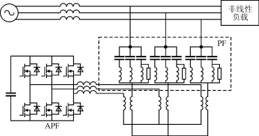 圖6所示為混合型有源濾波器的基本結構。它是在串聯(lián)型有源濾波器的基礎上使用一些大容量的無源L-C濾波網絡來承擔消除低次諧波,進行無功補償?shù)娜蝿?。而串?lián)型有源濾波器只承擔消除高次諧振及阻尼無源LC網絡與線路阻抗產生的諧波諧振的任務。從而使串聯(lián)型有源濾波器的電流、電壓額定值大大減少(功率容量可減少到負載容量的5%以下),降低了有源濾波器的成本和體積。從經濟角度而言,這種結構形式在目前是一種值得推薦的方案。但隨著電力電子器件性能的不斷提高,成本不斷下降,混合型有源濾波器可能被下面一種性能價格比更高的有源濾波器代替。