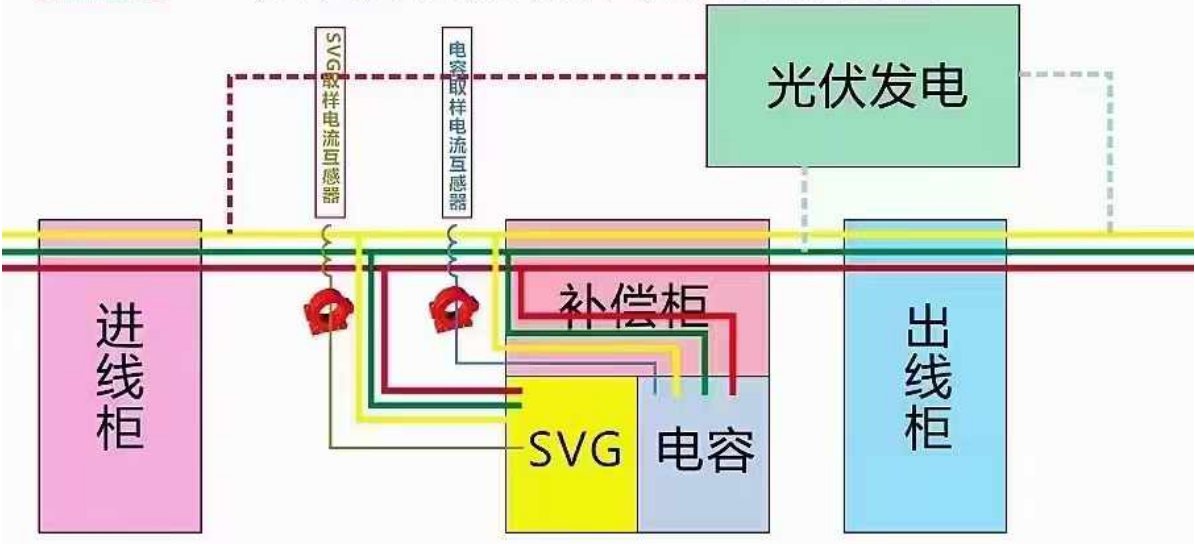 1.光伏接點,可以參考圖中的兩處綠色虛線的接線,對于補償?shù)男Ч麤]有太大的區(qū)別,此時SVG與無功補償控制器無法檢測到光伏提供給負載的有功電流及有功功率。也可以參考圖中紅色虛線來接線。此時補償柜的SVG及無功補償控制器可以采樣到光伏提供給負載的有功電流和有功功率。我們建議用戶使用綠色虛線的接法來接入光伏設備,此時無功補償控制器與SVG檢測到的電流、功率以及功率因數(shù)與計量表檢測的參數(shù)一致。