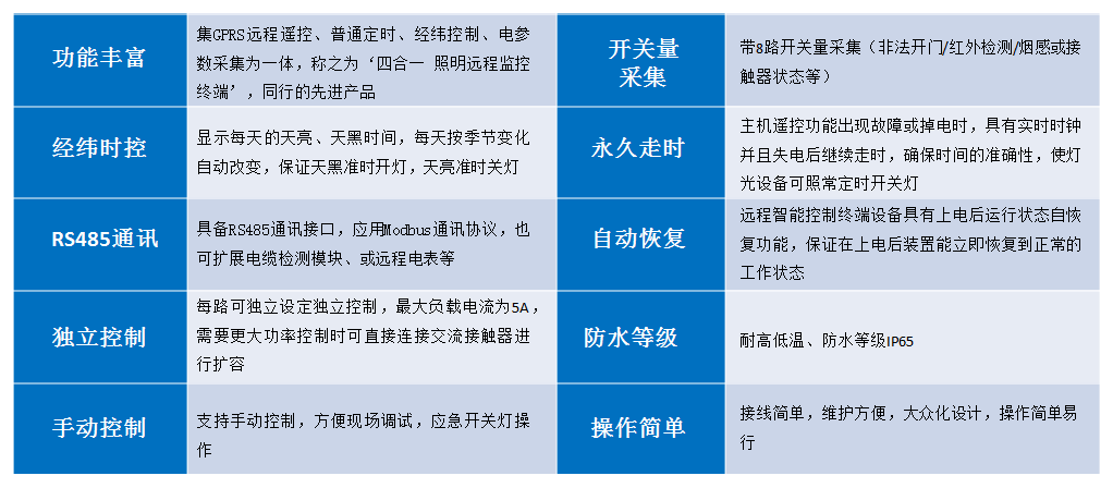 | 采用交流采樣的方法,采集最多24路電流、電壓、頻率、并進(jìn)行有無(wú)功率、有無(wú)功電量、功率因數(shù)、漏電電流等數(shù)據(jù)的運(yùn)算、處理、儲(chǔ)存; | 終端能保存全年365天的開(kāi)關(guān)燈時(shí)間表,當(dāng)與監(jiān)控中心失去聯(lián)系時(shí),會(huì)根據(jù)預(yù)先設(shè)定的程序自行開(kāi)/關(guān)燈,以確保照明設(shè)施的正常運(yùn)行。 |